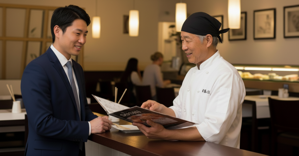- 食べ方の説明: つけ麺の食べ方、手巻き寿司の作り方など、外国人には馴染みのない食べ方を簡単なイラストや身振り手振りで説明できると、食事の体験価値が飛躍的に高まります。